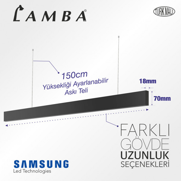 ULTRA SLIM LINEER sarkıt modelimiz 1,8x7cm ölçüleri ile lineer serimizin en incesidir. Gövde materyali yüksek ısı transferi sağlayabilen kaliteli alüminyumdan üretilmiştir. Gövde boyası elektrostatik toz boyadır ve korozyona dayanıklı olup uzun ömürlüdür. Ürünlerimiz 5 farklı boy ile satışa sunulmuş olup, farklı ölçü talepleriniz için bize ulaşabilirsiniz. Ürünlerimizde yüksek Işık veren ancak düşük tüketim sağlayan Samsung Marka Led kullanılmaktadır. Ürün ile birlikte 150cm ayarlanabilir askı seti standart olarak gönderilmektedir. Ürünlerimiz 2 yıl garantimiz altında olup herhangi bir sorunuz için Whatsapp hattımız üzerinden bize ulaşabilirsiniz
